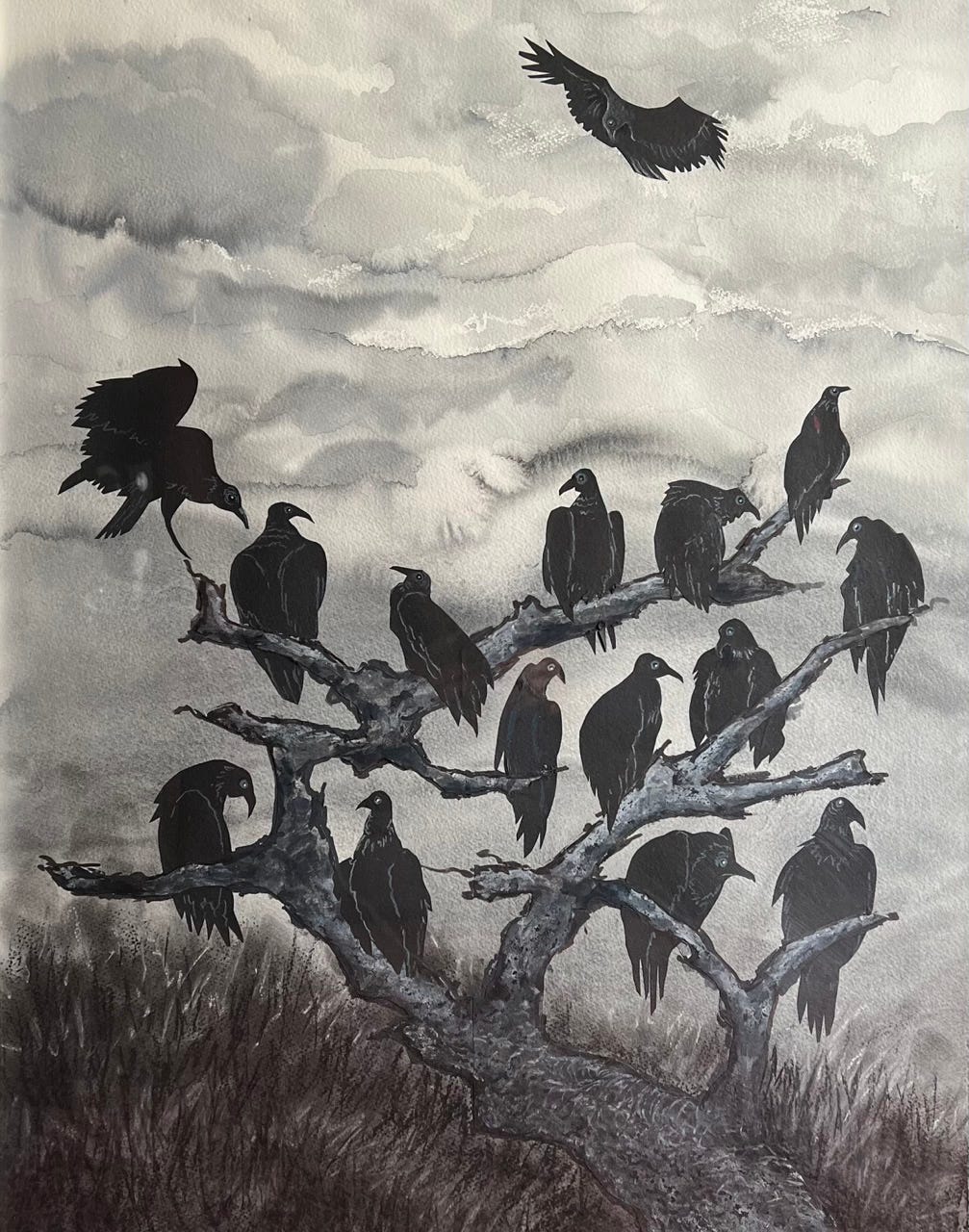 Watercolor paper, watercolors, chalk, oil pastels, charcoal, colored pencils and the vultures themselves were cut from black paper and pasted onto the tree.